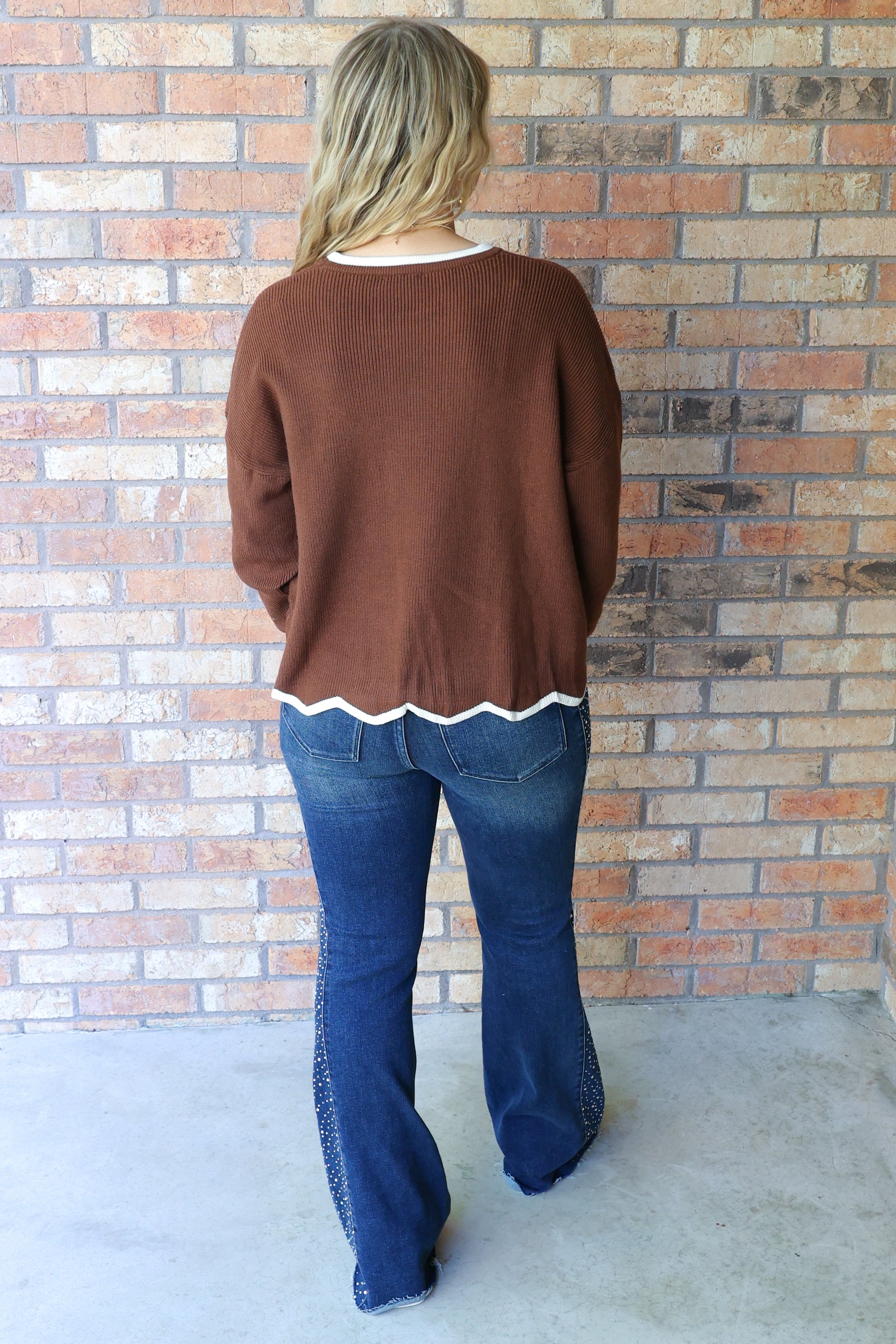 Knit Sweater with contrasting hem colors and a wavy hem. This will be your go to sweater this fall!