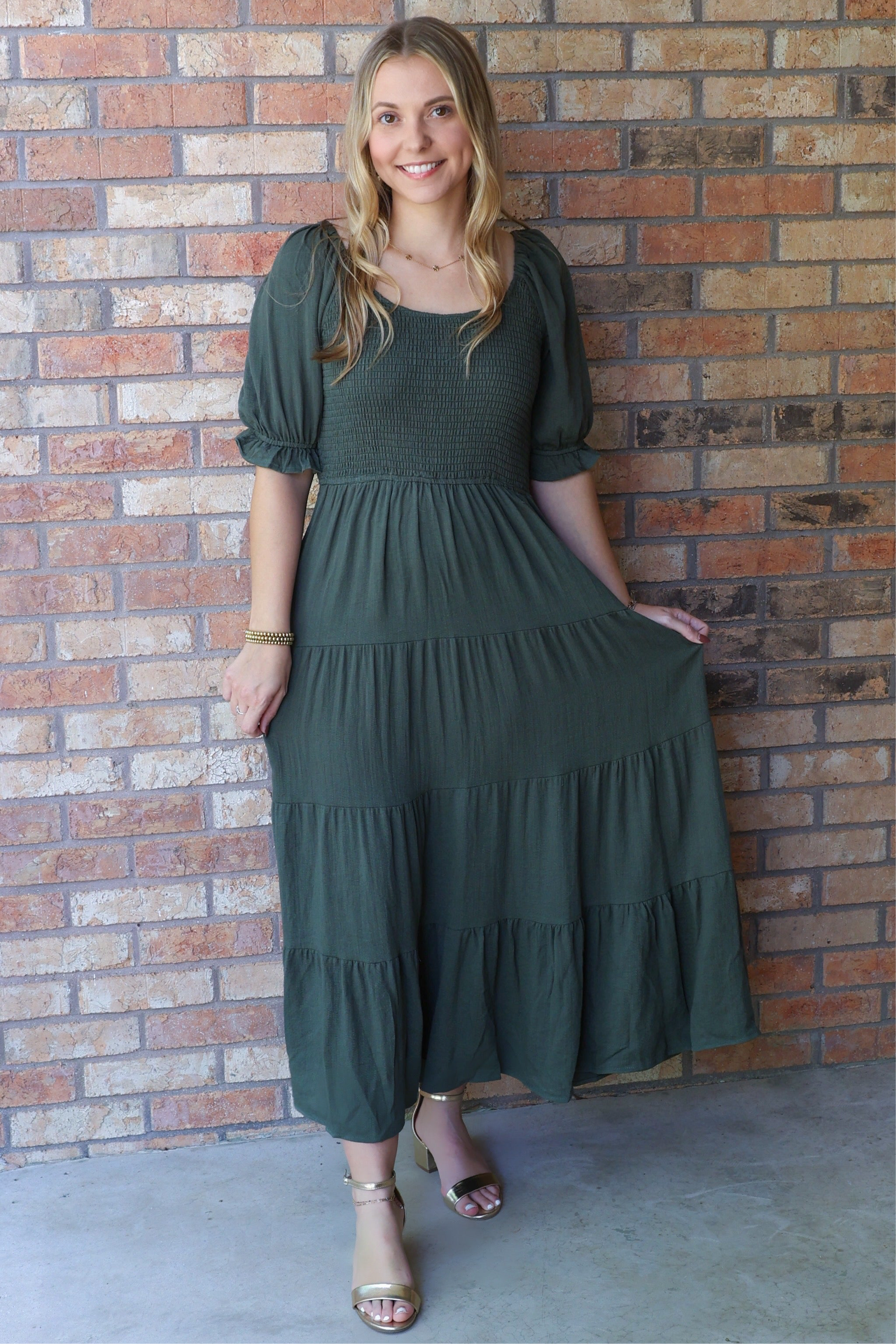 Jolene Smocked Tiered Maxi Dress, Forest Green