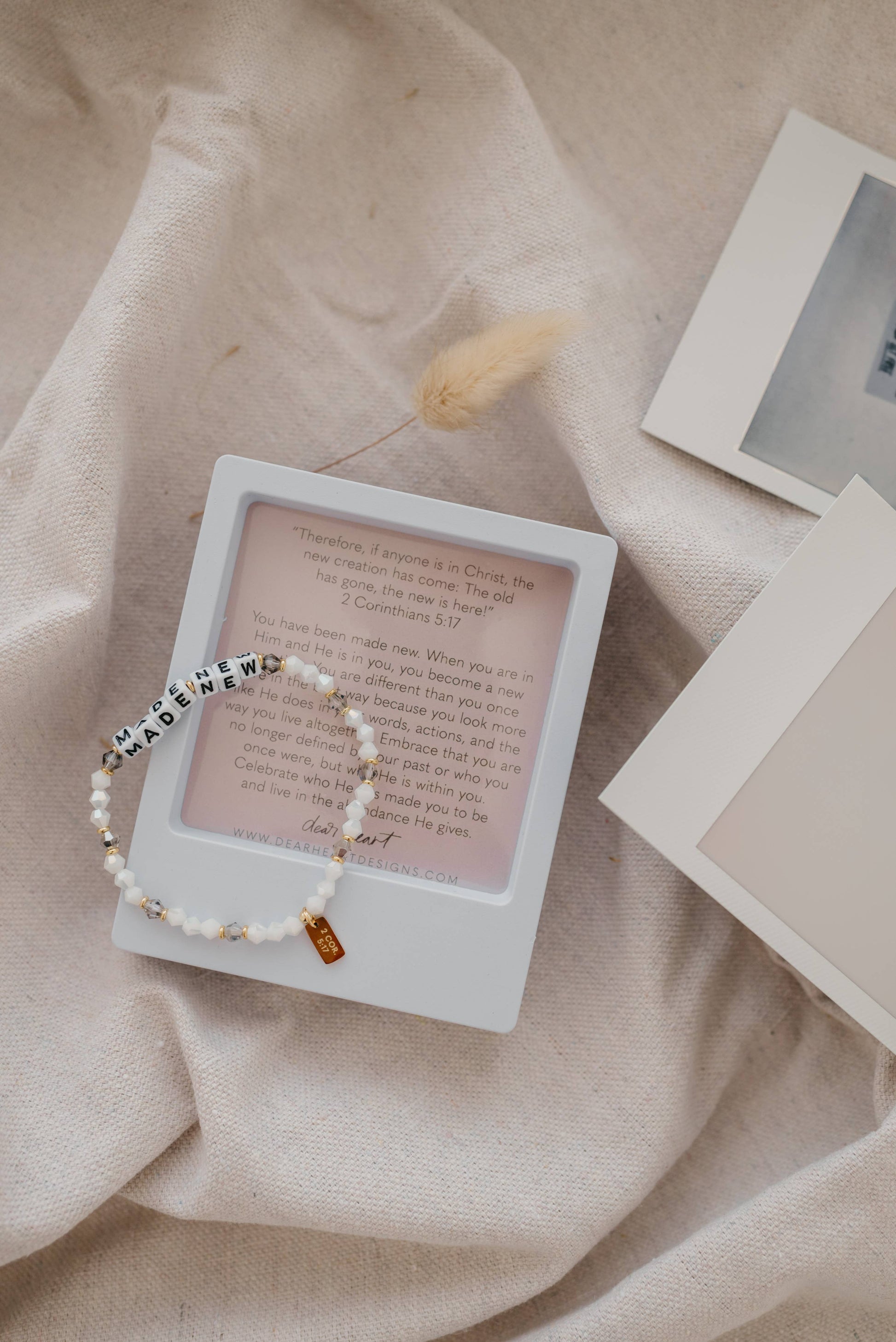 Details: -beaded stretch bracelet - 6.75" before stretching- size fits most -verse reference on attached gold tag -polaroid inspired packaging -personal note compartment inside -verse details on back