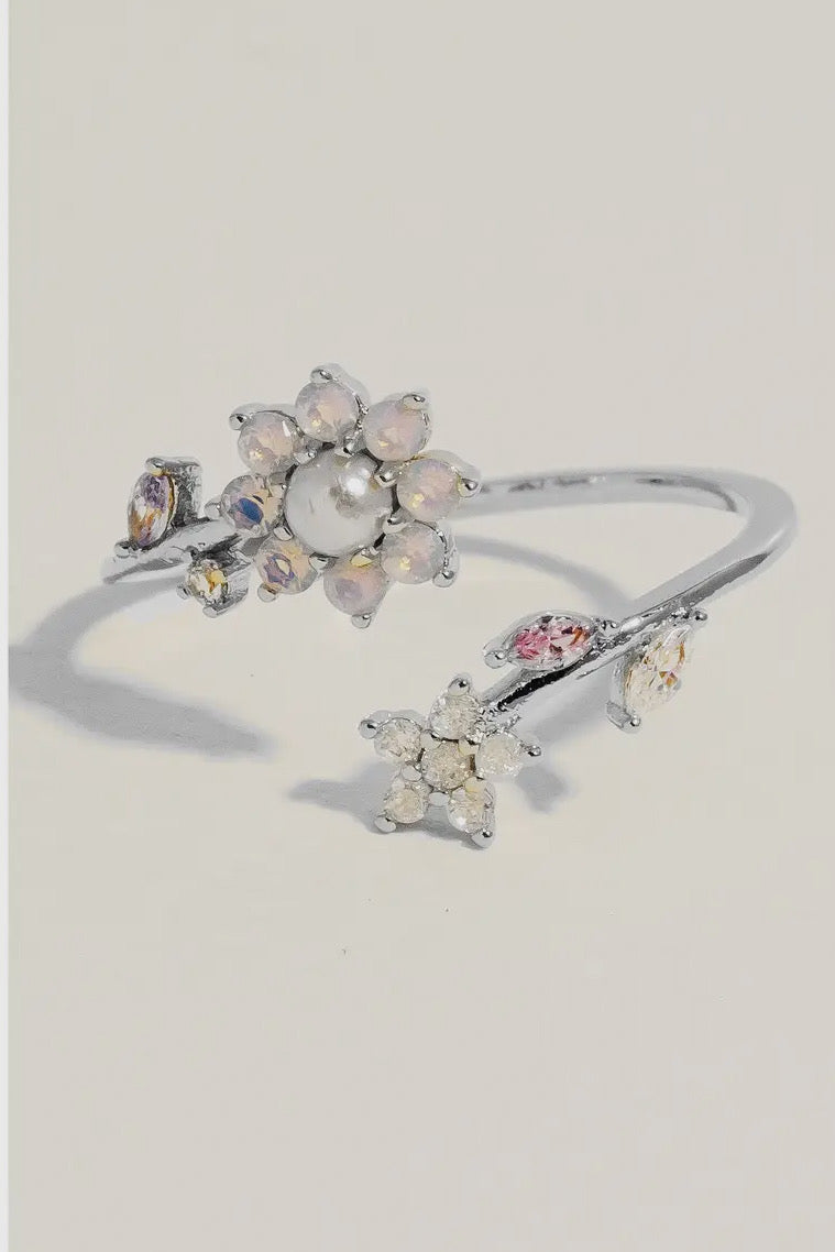 Effortlessly chic and always on-trend, this ring carries a charming mixed studded floral open band design. Redefine your wardrobe with this versatile accessory, a timeless addition that brings an air of sophistication to any look.