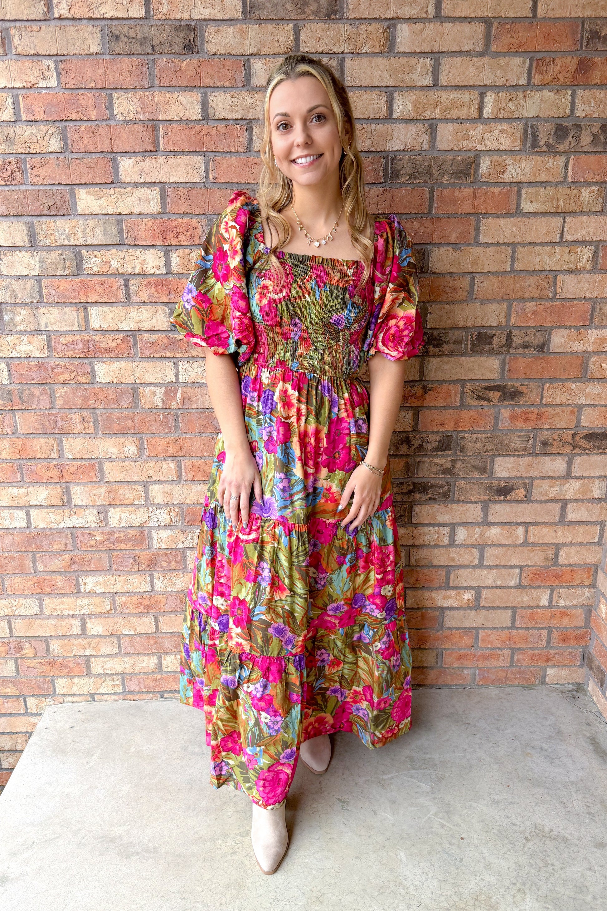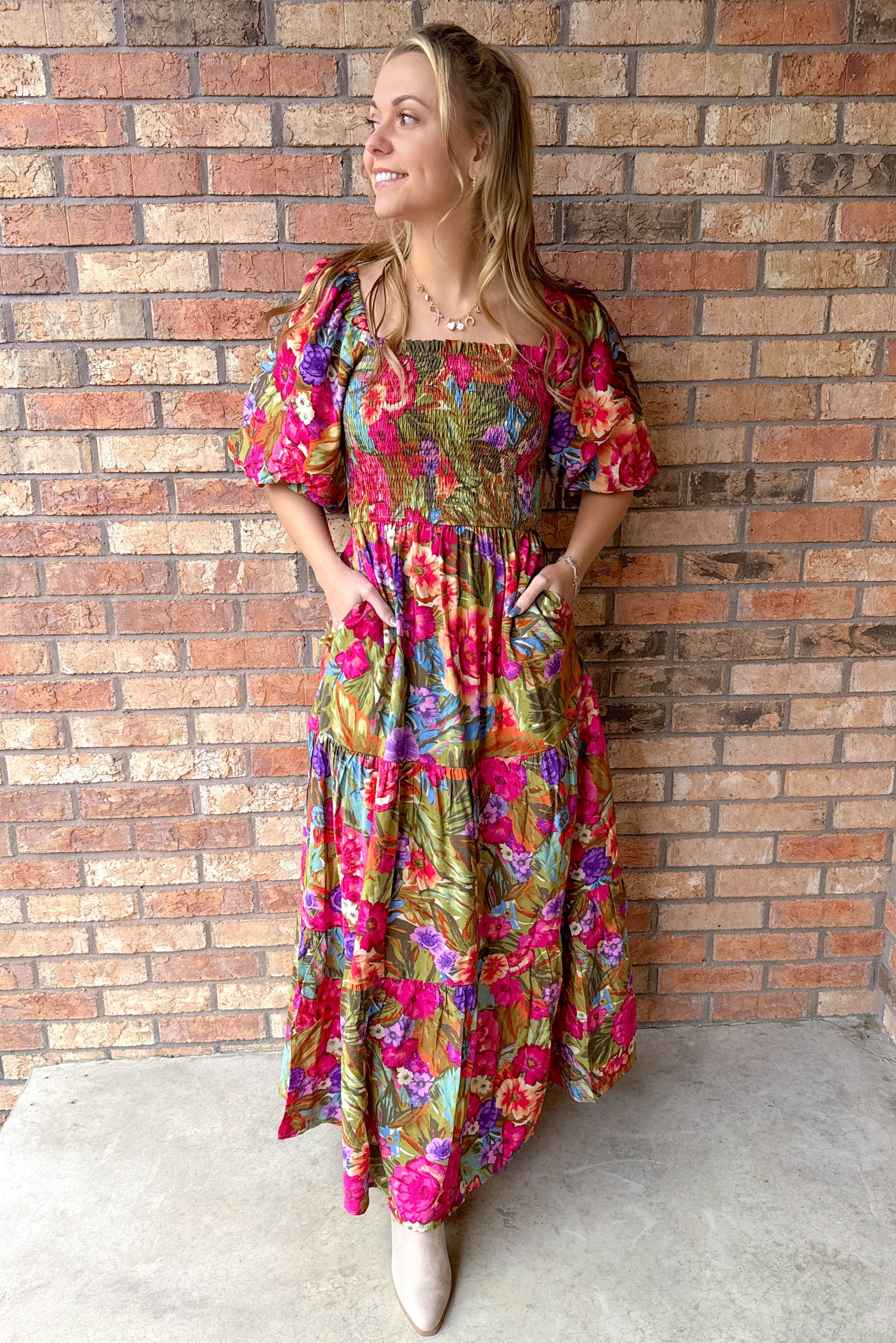 Beautiful floral printed maxi dress with short bubble sleeve and smocked top. Bodice has stretch. Features pockets.