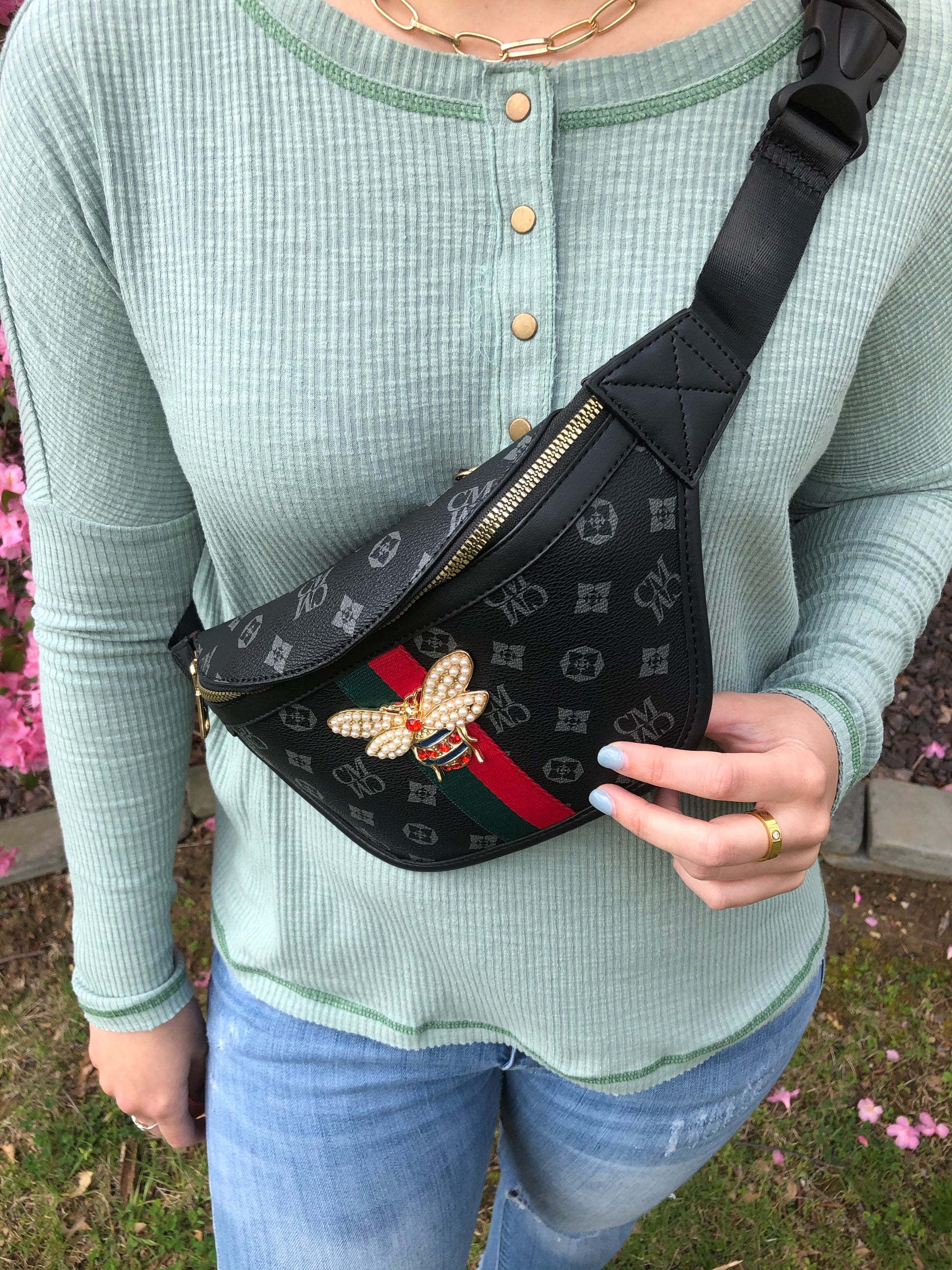 Faux vegan leather fanny pack featuring a zip top closure and gold-tone hardware. Strap is adjustable. Super trendy right now!