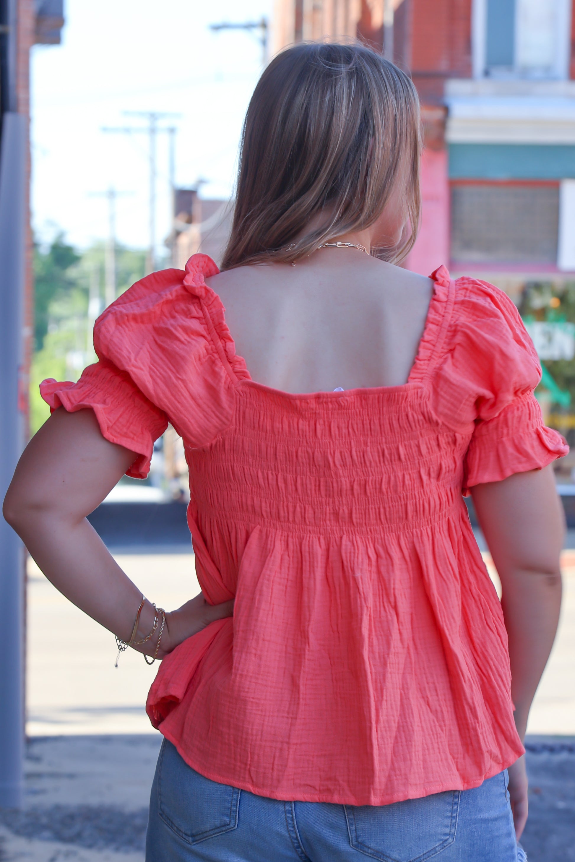 Short puff sleeve square neck top. This top features ruffles along shoulder seams. If in between sizes, size down.