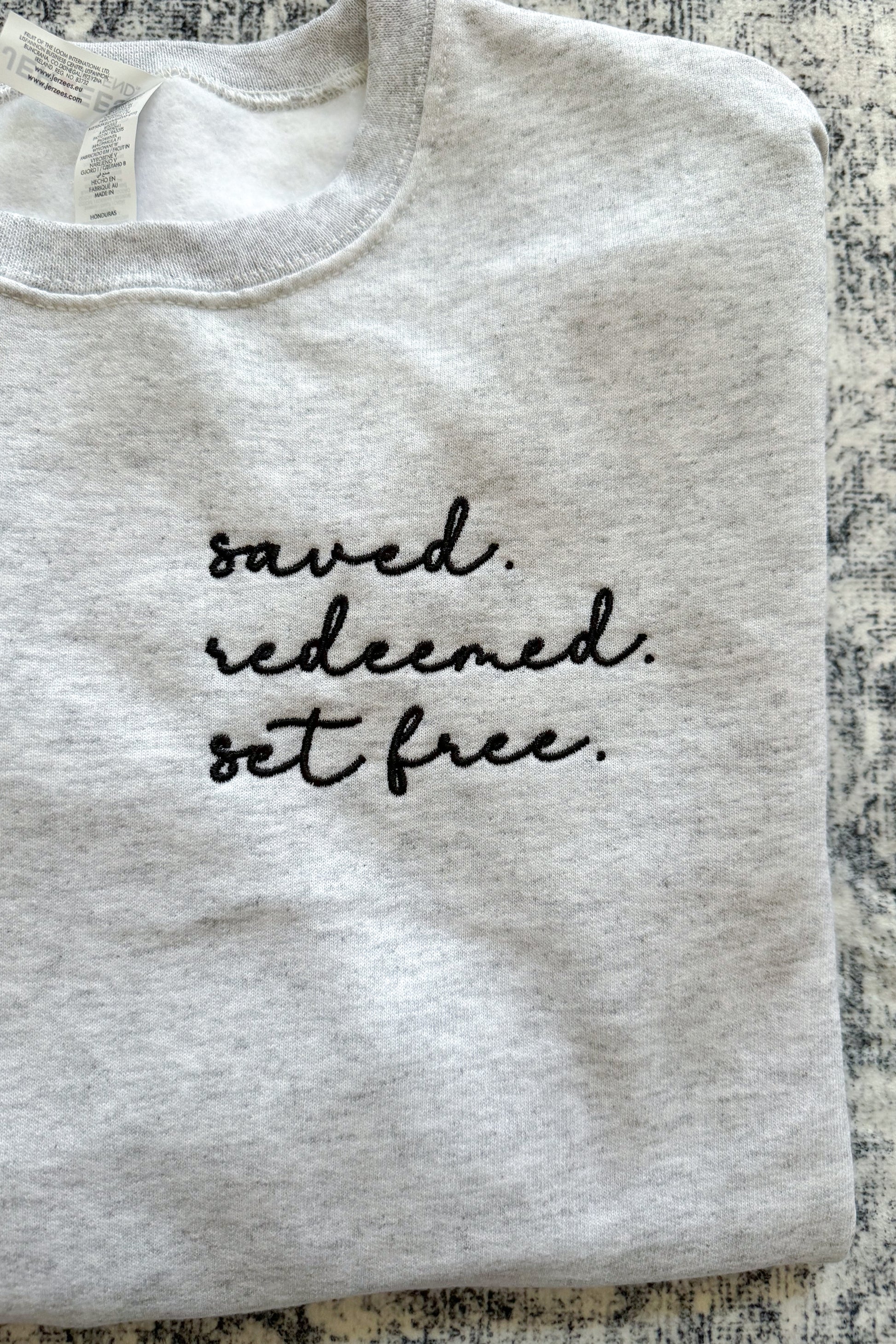 Saved. Redeemed. Set Free. Embroidered Sweatshirt, Ash Grey
