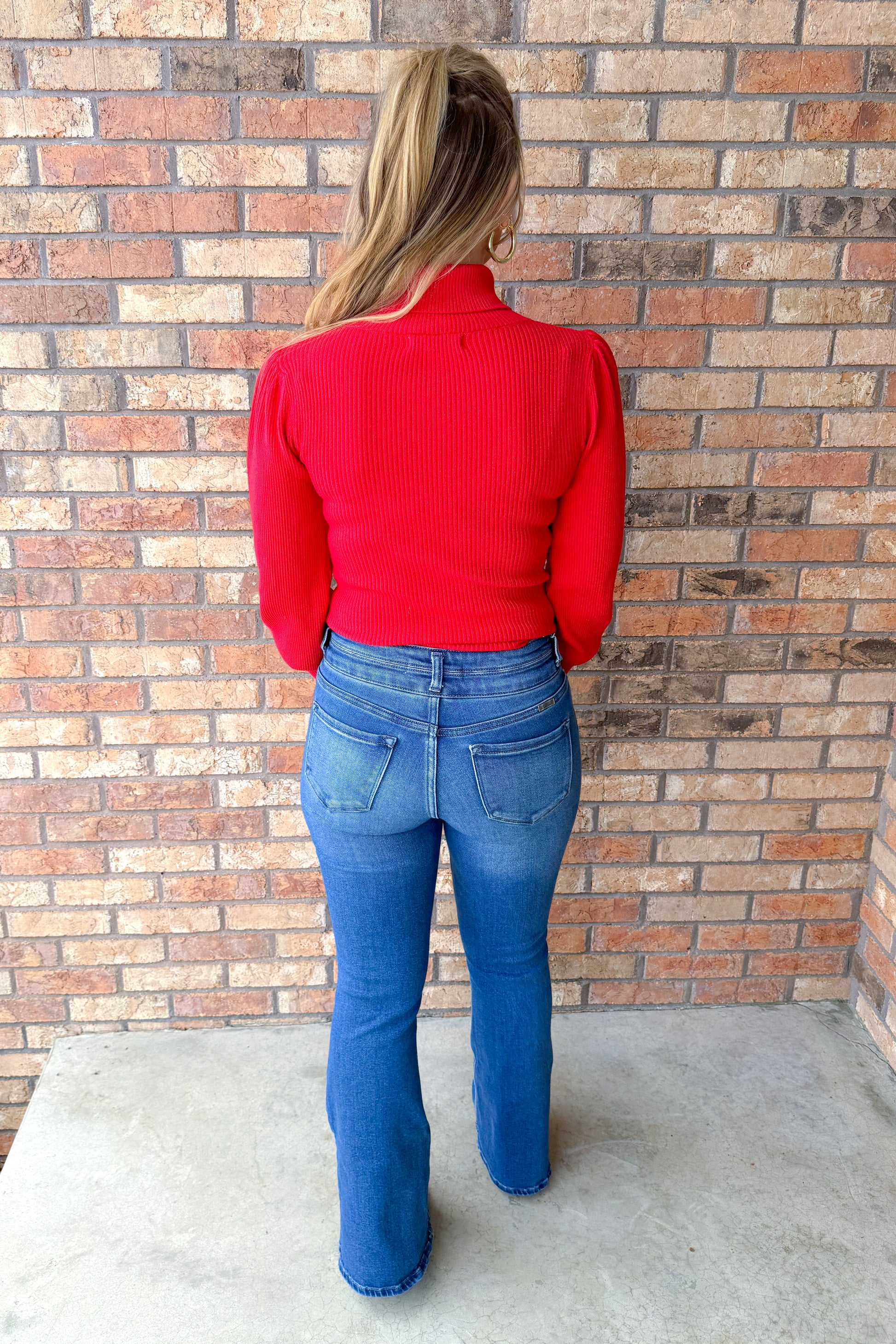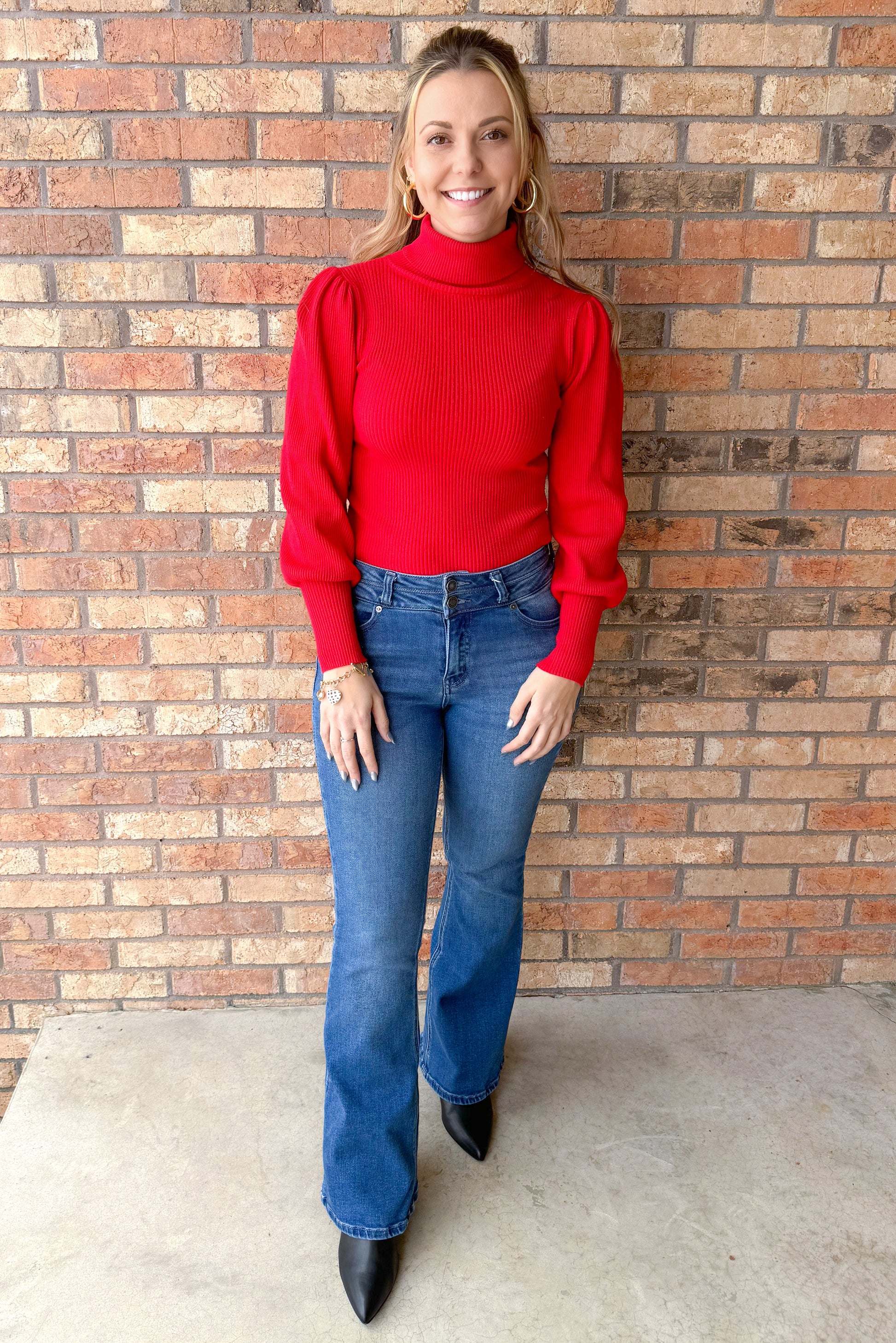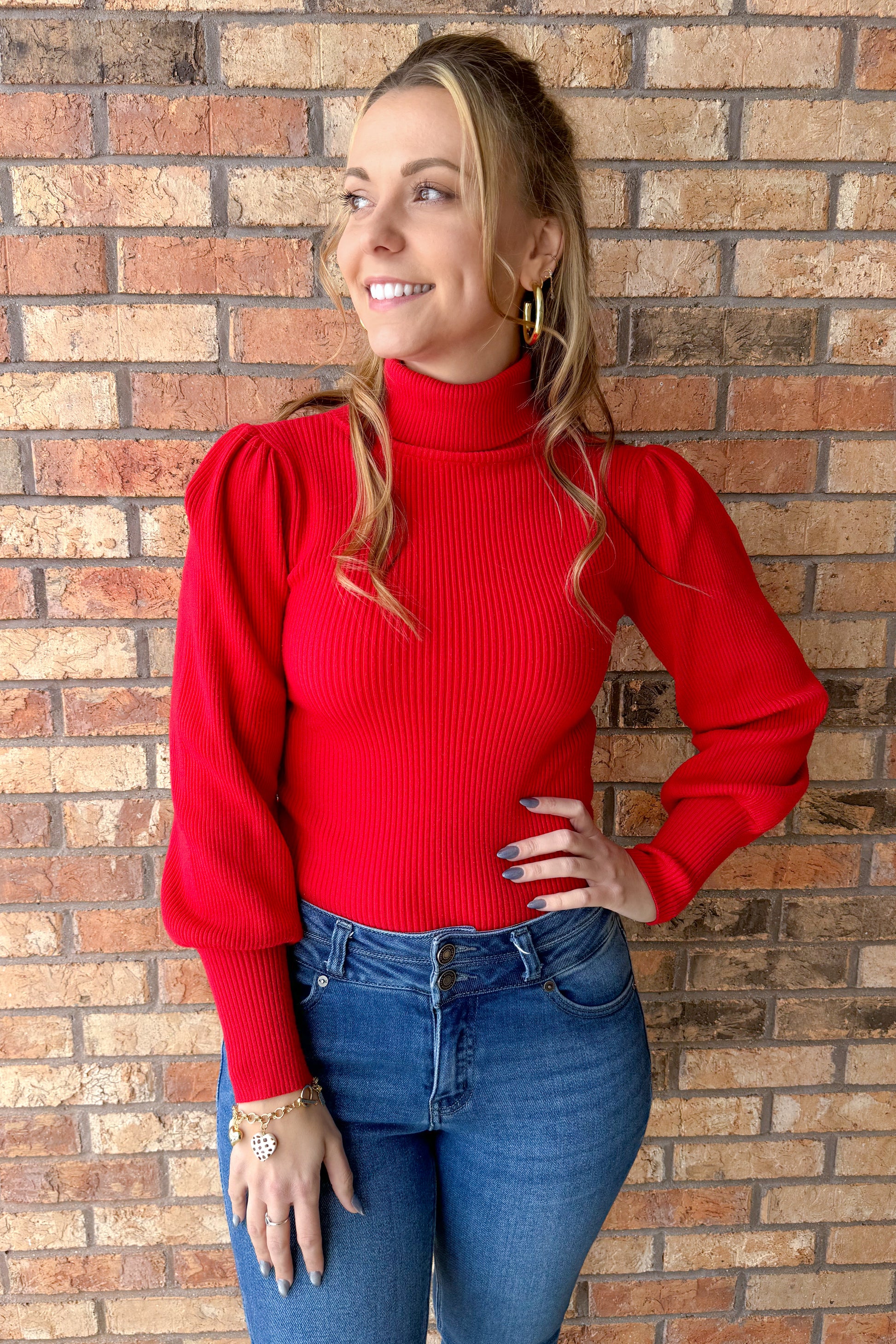 This gorgeous red sweater is calling your name! This ribbed turtleneck sweater is a show stopper and features a slight bubble sleeve. This is a form fitting sweater perfect for tucking into a cute skirt or pants.