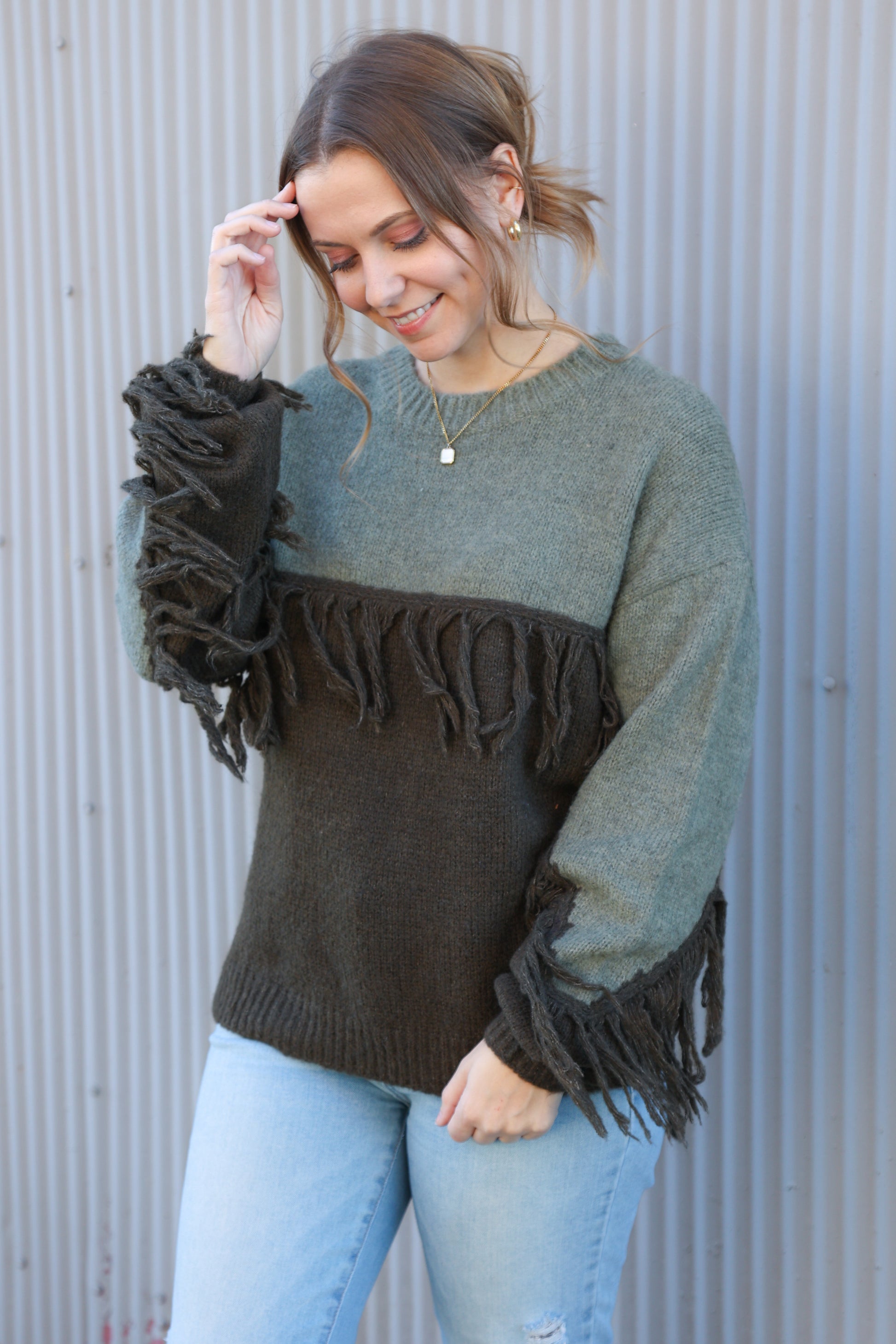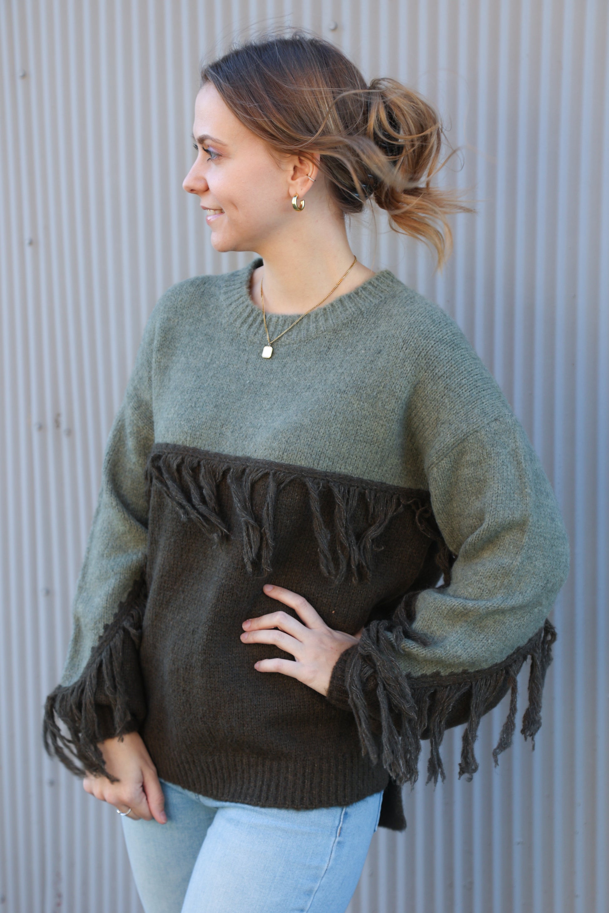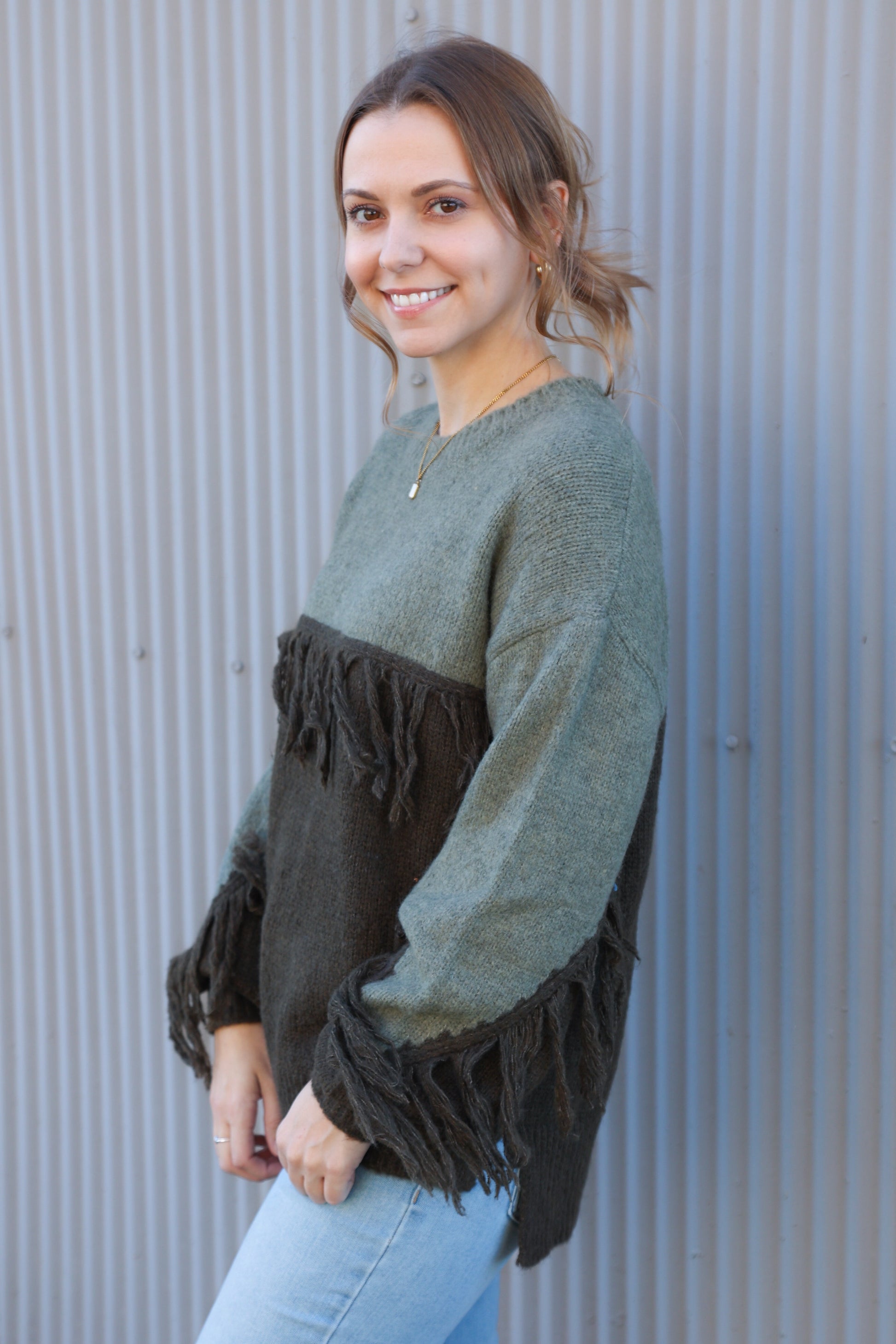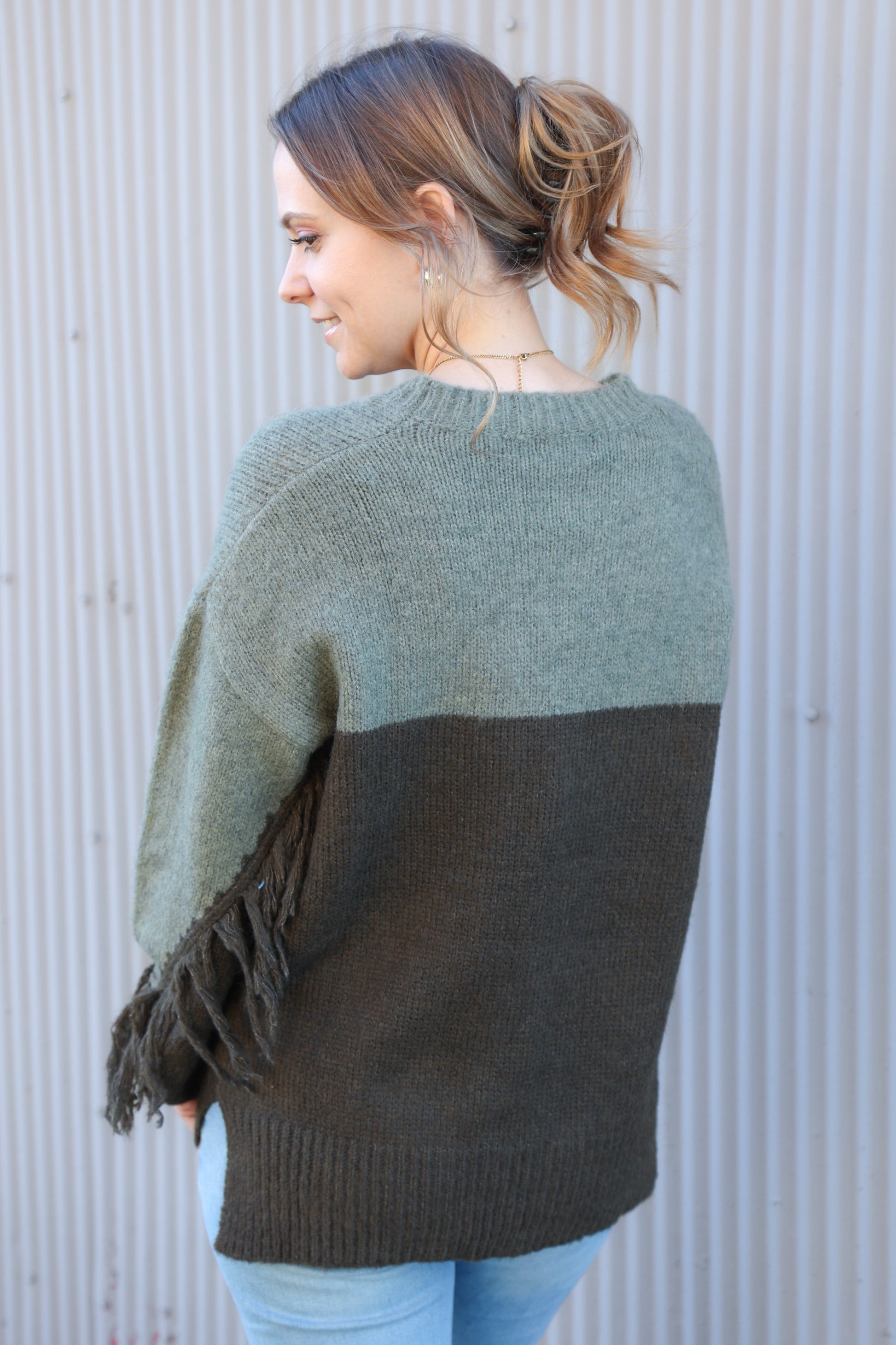 Super fun and fashionable color block sweater featuring fringe detailing. We recommend ordering your true size.